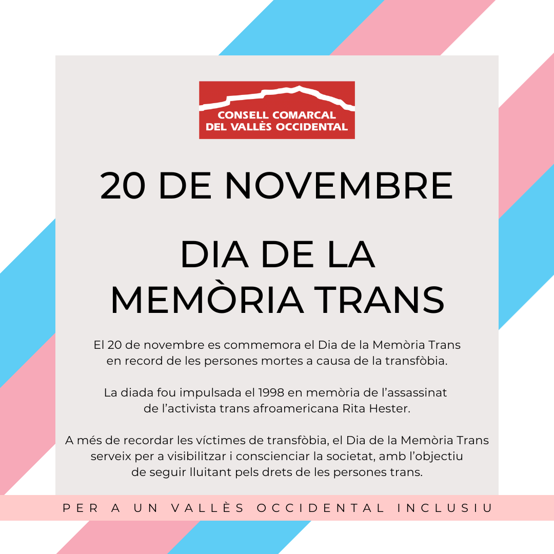 Avui, 20 de novembre, es commemora el Dia de la Memòria Trans en record de les persones mortes a causa de la transfòbia. La diada fou impulsada el 1998 en memòria de l’assassinat de l’activista trans afroamericana Rita Hester.