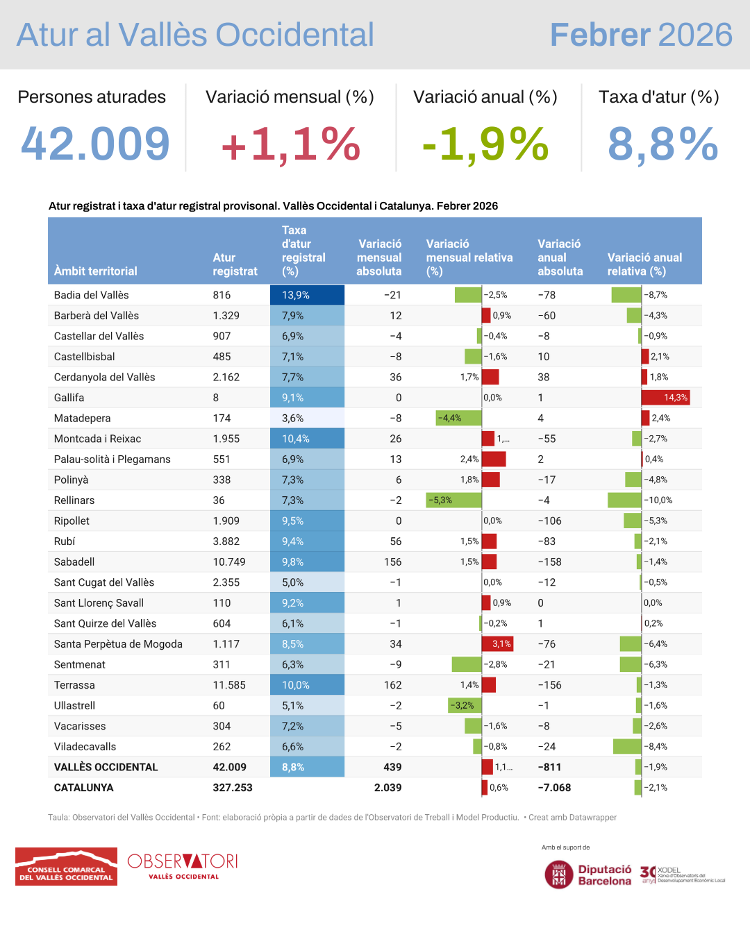 La taxa d’atur comarcal provisional se situa en el 8,8%, amb diferències destacades entre municipis: del 3,6% de Matadepera al 13,9% de Badia del Vallès.