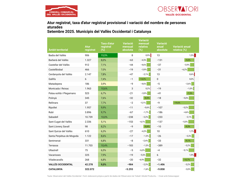 El setembre tanca amb 42.278 persones aturades al Vallès Occidental, 984 menys que a l'agost, el que representa un descens del 2,3%. Els darrers anys la desocupació ha disminuït després de la temporada d'estiu i, enguany, la caiguda ha estat superior a la de l'any passat, quan va ser de l'1,8%. Respecte del setembre de 2024, hi ha 1.406 persones desocupades menys a la comarca.