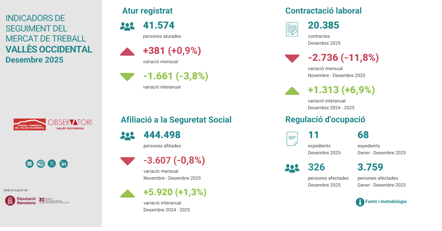 Pel que fa a la tipologia de contractes, el 32% dels contractes han estat indefinits ordinaris i el 45,9% eventuals. En comparació amb desembre de 2024, la contractació ha augmentat un 6,9% (1.313 contractes més) per l’impuls tant de la modalitat temporal (+7,9%) com la indefinida (+5%). Amb dades acumulades, entre gener i desembre de 2025, la comarca suma 266.241 contractes.